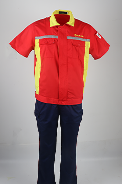 秋季和夏季工作服的主要區別在面料和上衣袖子區別上,夏季工作服采用的是上衣短袖下身長袖套裝,這次的設計考慮到工作環境因素所有有反光條設計和防靜電設計,天曼小編要再次提醒大家,防靜電設計一定要認準LA標志哦,在顏色的選擇上上衣為紅黃色搭配,下身是深藍色,整個套裝看起來熱情奔放,我已經能腦補到路航石油員工穿著認真工作的樣子了。