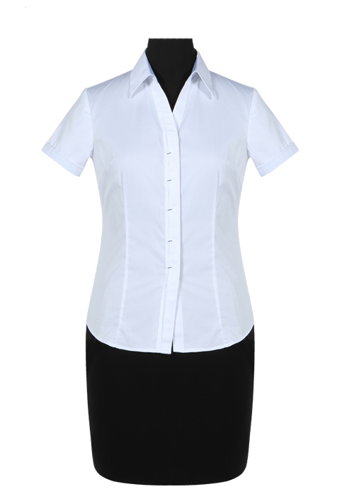 款式:白色V領CVC襯衫短袖女裝
